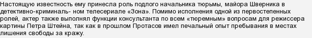 По роли в телесериале «Зона» публика знает актера в роли майора Шверника. Свой тюремный срок отбывал в трудный период биографии знаменитый актер. В Москву отправляется Олег Протасов после освобождения из тюрьмы. Поскольку жилья и денег не было, ему поначалу приходилось ночевать даже в подвале и метро.