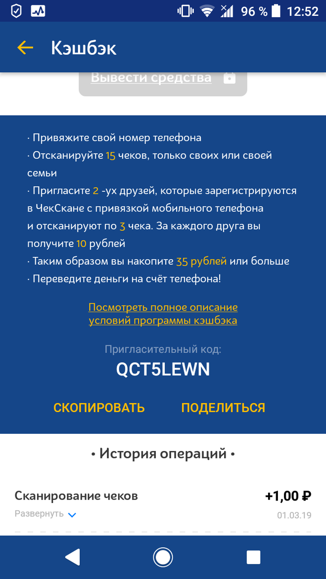 Приложение мало весит и не содержит рекламы, платит 1 рубль за сканирование 1 чека любого, где есть QR-код, начисления поступают моментально на ваш счёт. Вывод денег с 50 рублей на телефон, в первый раз нужно 15 чеков сканировать и пригласить 2х друзей, которые введут уже ваш код и сканируют по 3 чека, привязав свой телефон.