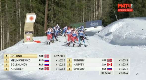 И тут начинается невероятное! На отрезке 21,6 км Холунд втопил, и создал себе приличный гандикап в 12 секунд!