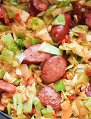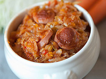 • Если есть капуста, то можно потушить ее с сосисками или колбасками с томатным соусом.
