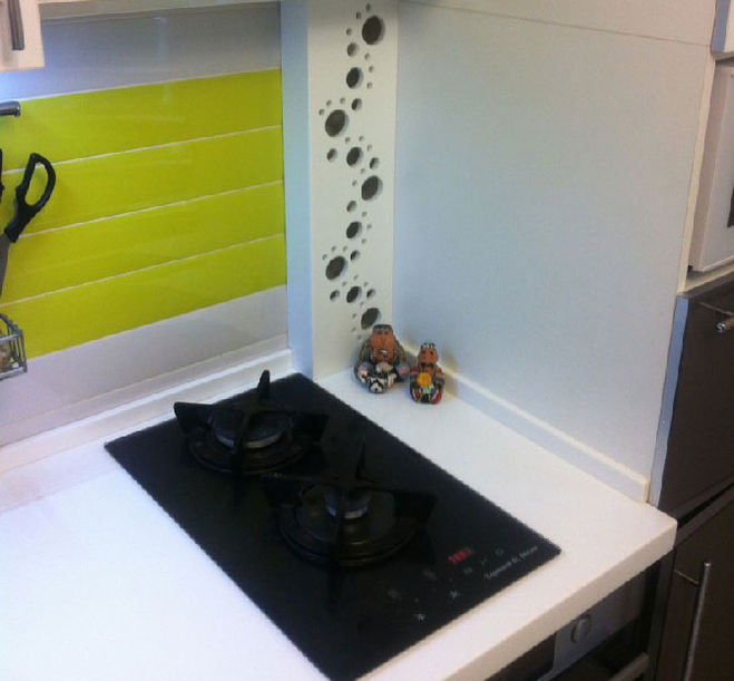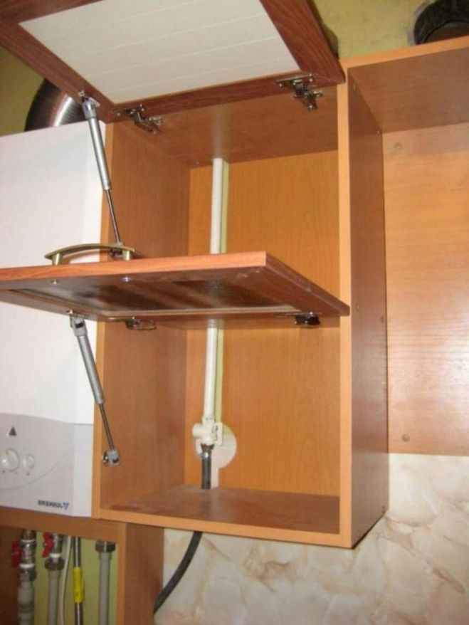 Газовые трубы и шланги должны быть легко доступны в любое время дня и ночи. Это не я придумала, это требование норм безопасности при пользовании бытовым газом. Постольку поскольку газ в смеси с воздухом очень даже взрывоопасная смесь и примеров тому по телевизору чуть ли не еженедельно видим достаточно, поэтому нормы безопасности требуют того, чтобы к трубам и шлангам был моментальный доступ для осмотра и ремонта при необходимости. Если шланг нарушает эстетику вашей кухни, сделайте декоративную накладку, которая снимается легким движением руки, только она должна быть с обязательной вентиляцией, ну или спрячьте шланг в шкафчик вот так ка-то: