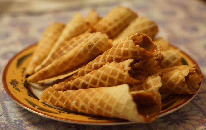 Второй вариант испечь если умеете печь либо купить готовые трубочки пустые и наполнить их сгущенкой.
