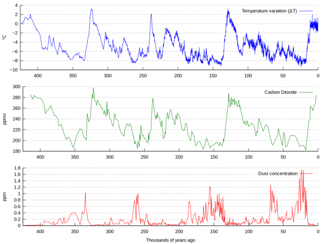 Минимумы нижнего графика на этой картинке — ледниковые периоды. Максимумы — климатические оптимумы. Сейчас последнее. Температура пока ниже, чем была в предыдущий оптимум.