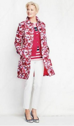Одно время страстно хотела купить себе демисезонное пальто с цветами, есть неплохие варианты для дам среднего возраста, но не такие яркие, а одно- двух- трехцветные и продумывала варианты комбинаций с другой одеждой. Однозначно: черные брюки, чуть клешеные или прямые, ботиночки или мокасины, туфли на невысоком каблуке, водолазку или легкий свитеров черного цвета или тон одного из вариантов цветов пальто, небольшой шарфик из шифона или шелка, в тон обуви или другого цвета из цветков на ткани пальто, можно пуловер с закрытой шеей.
