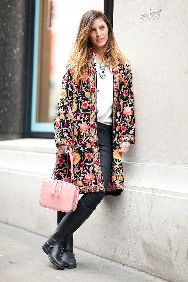 Пальто с цветами требует осторожного сочетания с аксессуарами. Также важно подбирать спокойные тона одежды к такому пальто.