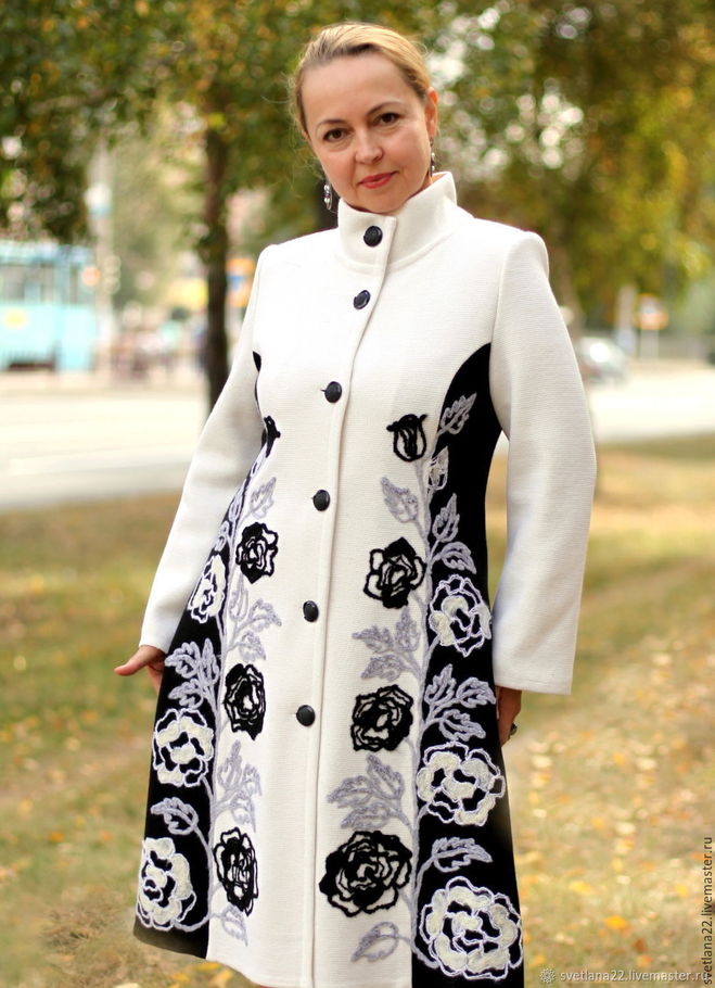 Ведь цветы на ткани пальто могут быть не обязательно яркими. У мой подруги было пальто с поясом, низ в виде полусолнце, черного цвета, а цветы были оригинальной формы белого цвета. Исключительный шик!