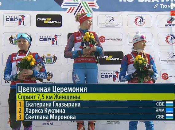 Двадцать восьмого марта стартовали последние биатлонные гонки, на этот раз женская спринтерская гонка на тюменской трассе в рамках чемпионата России. Трасса "Жемчужина Сибири" оказалась для Глазыриной Екатерины золотой после двухлетней дисквалификации. представляющая ныне Свердловскую область. Лариса Куклина заняла серебряный подиум. Бронзовая медаль у Мироновой Светланы.