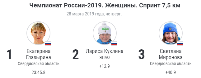 В спринтерской гонке на чемпионате России победила Екатерина Глазырина, которая несколько лет назад была одним из лидеров национальной сборной. А пропускала пару лет она из-за допинга, то есть отбывала дисквалификацию. Вернулась она конечно триумфально, так как победила практически без шансов и к тому же показала отличную стрельбу. Второе место заняла Лариса Куклина, а вот третье место заняла Светлана Миронова. То есть результаты довольно ожидаемы, так как члены сборной команды заняли призовые места, показав свой высокий класс. Удивляет разве что победа Глазыриной и её неплохая готовность, но этого тоже можно было ожидать, так как она опытная спортсменка.