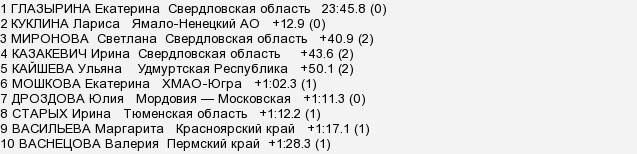 Ульяна Кайшева (Удмуртия), Ирина Старых (Тюмень) — 8 место, Маргарита Васильева (Красноярск) — 9. Во втором десятке оказались Наталья Гербулова и "кореянка" Екатерина Аввакумова. У Виктории Сливко удивительный для неё провал в стрельбе — 4 промаха на лежке и один на стойке.