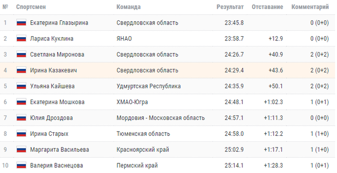 Третий результат у Светланы Мироновой с двумя промахами, всего лишь три секунды отделили ее от соратницы по команде Ирины Казакевич.