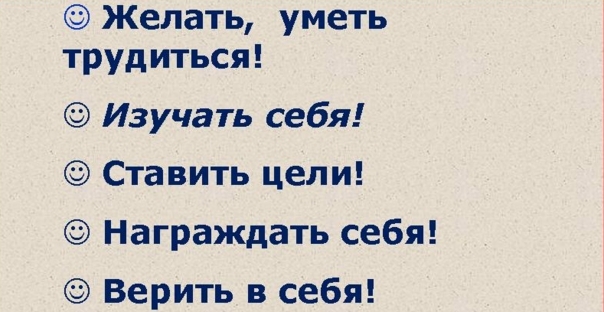 3) Никогда не сомневаться в успехе, то есть твердо верить в себя, при этом ставя может быть и труднодостижимые, но все же реальные цели.