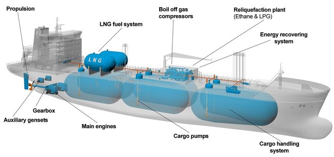 Газ перевозят специальными танкерами, на которых смонтированы "танки", то-есть емкости для сжиженного газа (метана). Емкость изготовлена из специального сплава "инвара"- Никель 36% и остальное железо. Толщина стенки в несколько мм. Потому стенки делаются гофрированными. Температура газа -163 градуса по цельсию.