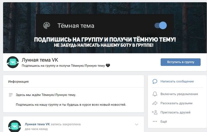 Введение темной темы для андроидов сделали интереснее — ее можно включить, написав комментарий «темная тема» в соцсети под любой записью.