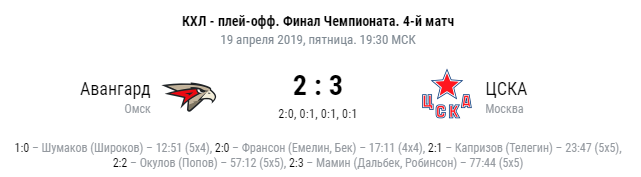 Таким образом, вчера ЦСКА со счетом 3:2 (ОТ) победило Авангард и со счетом 4:0 победило Авангард в финальной серии плей-офф кубка Гагарина 2018-2019.