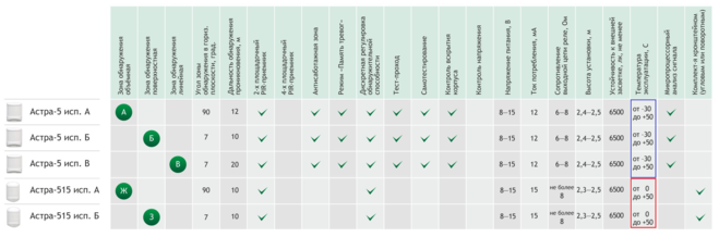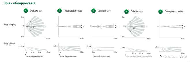 В зелёном кружочке А — Астра-5 исполнение -А Зона обнаружения — Объёмная