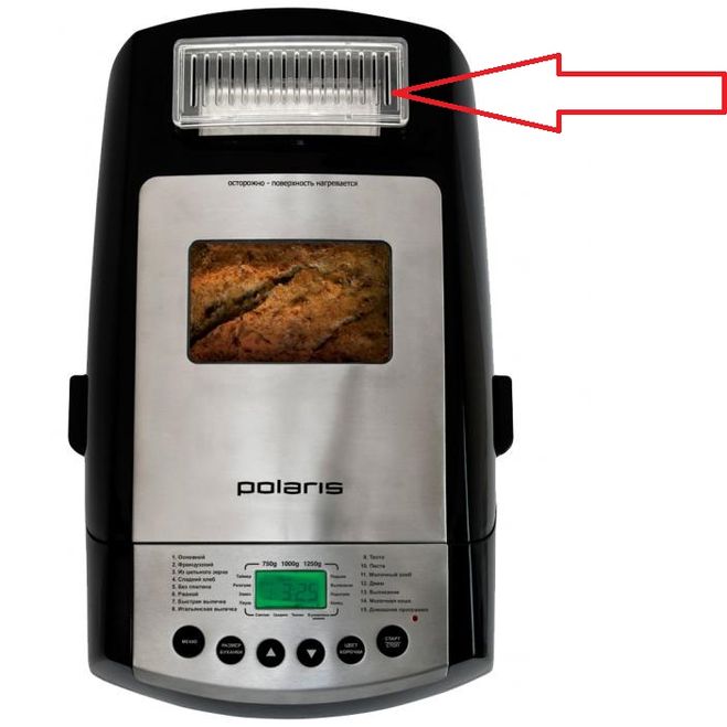 Должен быть специальный отдел, куда засыпаются орехи, изюм и прочие ингредиенты. В процессе приготовления, они автоматически высыпаются в тесто. Это очень удобно, в плане автоматизации процесса приготовления. Главное соблюсти рецепт и выбрать нужную программу в хлебопечке, которая соответствует ожидаемой выпечки. У нас polaris — вот стрелкой указан данный отдел.