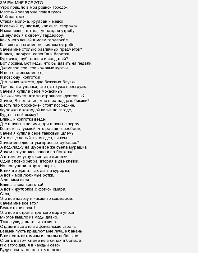 Я стараюсь подбирать вещи так, что-бы можно было комбинировать их друг с другом и получался бы обновленный образ. Джинсы, блузки, жилетки, юбки, платья. И конечно платки всякие и шарфики. Теплых платьев у меня три. Есть еще севшее, ставшее коротковатым. Я его надеваю теперь с джинсами. Получается стильно. Юбок две. Джинсы. Ну и блузоны к джинсам в количестве три штуки. Еще пара блузок и пара жилеток и пара джемперов. На лето три пары платьев. Мне хватает.И бывает так, что купив новую вещь, я из нее не вылезаю какое-то время. Ношу не снимая. Потом любовь проходит. Мне теперь редко нравится вещь так, чтобы хотелось ее непременно купить.