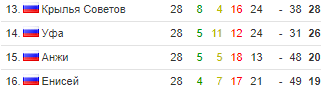 В 27 туре чемпионата России по футболу определились команды, которые покинут премьер-лигу в этом году. Махачкалинский Анжи, занимавший перед этим туром предпоследнее место, играл у себя дома с тульским Арсеналом. Шансы Анжи оставляла только победа или хотя бы ничья, но они проиграли Арсеналу, который во второй части чемпионата непобедим, со счетом 0-1. Теперь 14 место для них недосягаемое. Красноярский Енисей-аутсайдер чемпионата России дома играл с Краснодаром и был разгромлен 0-4, что тоже означает, что они уже не догонят Уфу, занимающую 14 место. Итак, премьер-лигу покидают Анжи и Енисей, и им на смену приходят две первые команды ФНЛ, которые тоже определились в эти выходные. Ими стали Тамбов и Сочи, которых уже никто не сможет догнать.