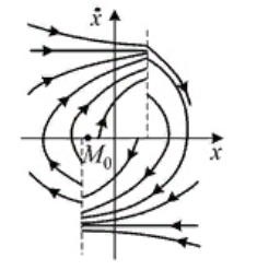 В данном случае в фазовом портрете линии в нижней и в верхней полуплоскости стремятся к горизонтальной линии (после линий переключения)..