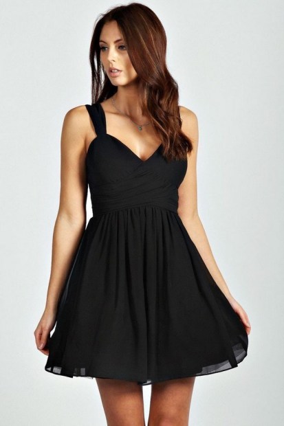 Лучше взять коктельное маленькое чёрное платье, длиной до колена или до середины икры, с красивым вырезом или на одно плече или с открытыми плечами и вырезом типа бюстье, из ткани глубокого чёрного цвета, возможно бархата на тканевой, а не на трикотажной основе, которое выигрышно будет выделять вас среди пестрой толпы элегантностью и простой, а потом ещё не один раз сослужит вам службу. Или как вариант замены платья футболка с принтом и юбка из тюля типа американки или пачки из фатина.