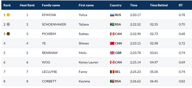 В отсутствии в финале заплыва американки Лилли Кинг, которая была дисквалифицирована в предварительном заплыве за неправильное прохождение поворота, явной фавориткой выглядела россиянка Ефимова. Помешать ей повторить свой двухлетний триумф могло только чудо, на которое надеялись соперницы. Юлия Ефимова начала свою партию с большой победы на дистанции 200 м брассом, она намного опередила остальных и вернулась домой с удобной разницей в 2,35 секунды, опередив Татьяну Шоенмейкер из Южной Африки. Третьей бортика коснулась канадка Пикрем.