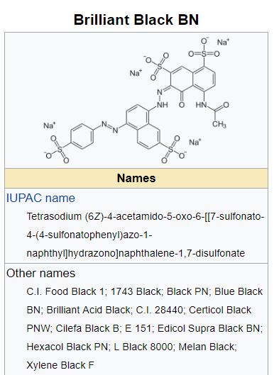 Оно растворяется в воде и используется как пищевой краситель чёрного оттенка. Ему присвоен кодовый номер E151. Это далеко не самое популярное вещество, оно запрещено в США, Канаде, Японии, Норвегии, Финляндии, но при этом в ЕС разрешено. Как эти взаимоисключающие правила действуют — вопрос не ко мне.