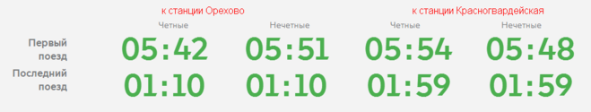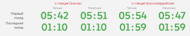 - Существует график отправления первого и последнего поездов от метро "Домодедовская" в направлении станций "Красногвардейская" и "Орехово"по будням