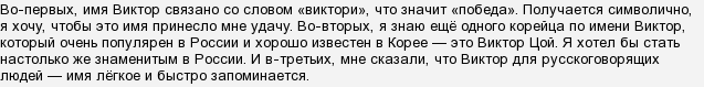 О том, что Виктора Цоя в Республике Корея любят и чтят, говорит тот факт, что корейский, а ныне российский олимпийский чемпион-конькобежец, урожденный Ан Хён Су, которого мы знаем как Виктора Ан, взял себе имя Виктор, в том числе, и в честь Виктора Цоя. Вот что он сам сказал по этому поводу: