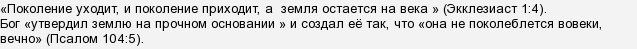 Славик, вот для наглядности допустим такой пример: магазин со всякими тов-ми. На нек-рых товарах есть срок службы. Вопрос: кто определяет этот срок: опытн продавец или конструктор/изготовитель? Вы наверняка согласитесь, конструктор, потому что он лучше знает, сколько времени прослужит его творение. Так же и наш Творец знает лучше всех, скол будет существ-ть Земля. В Его Слове (Библии) ясно говорится — Он «утвердил землю» навечно. Её срок службы неограничен — он никогда не истечет!.