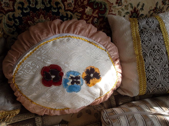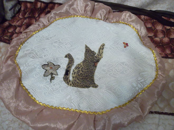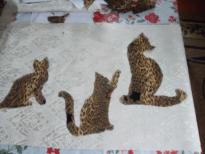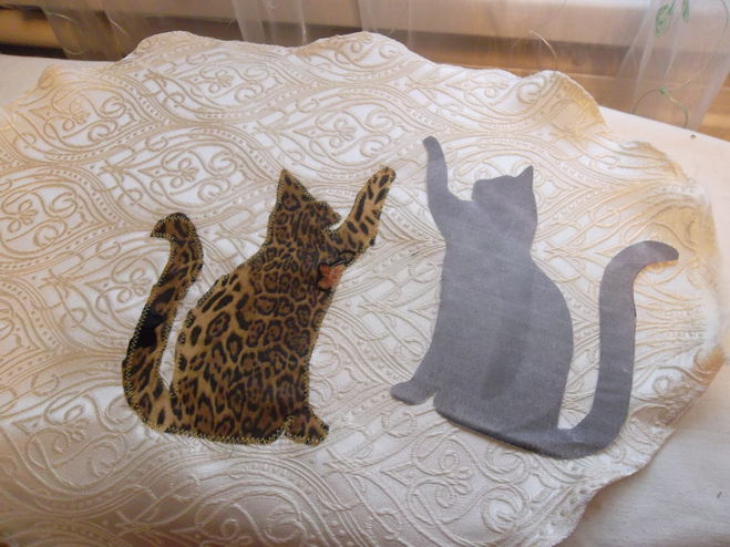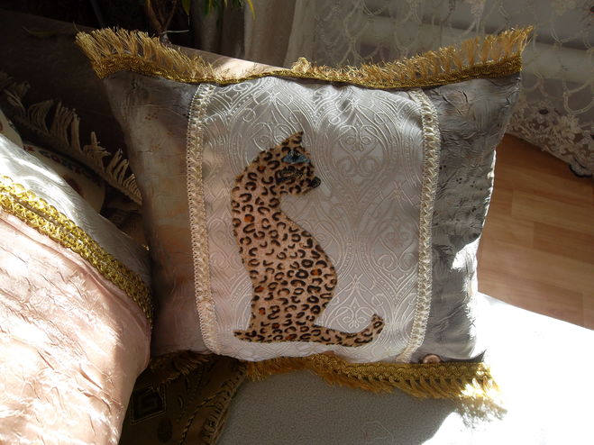 Собрала я дома остатки ткани от штор, другие кусочки ткани, пошла в магазин, набрала всякой тесьмы,бахромы, флизелин на клеевой основе, молнии (там всего полно- глаза разбегаются). И села придумывать схемы подушек, с интернета скачала силуэты кошечек, леопарда,цветочков, перевела их на ткань, вырезала, приклеила на ткань,и, вот что у меня получилось.